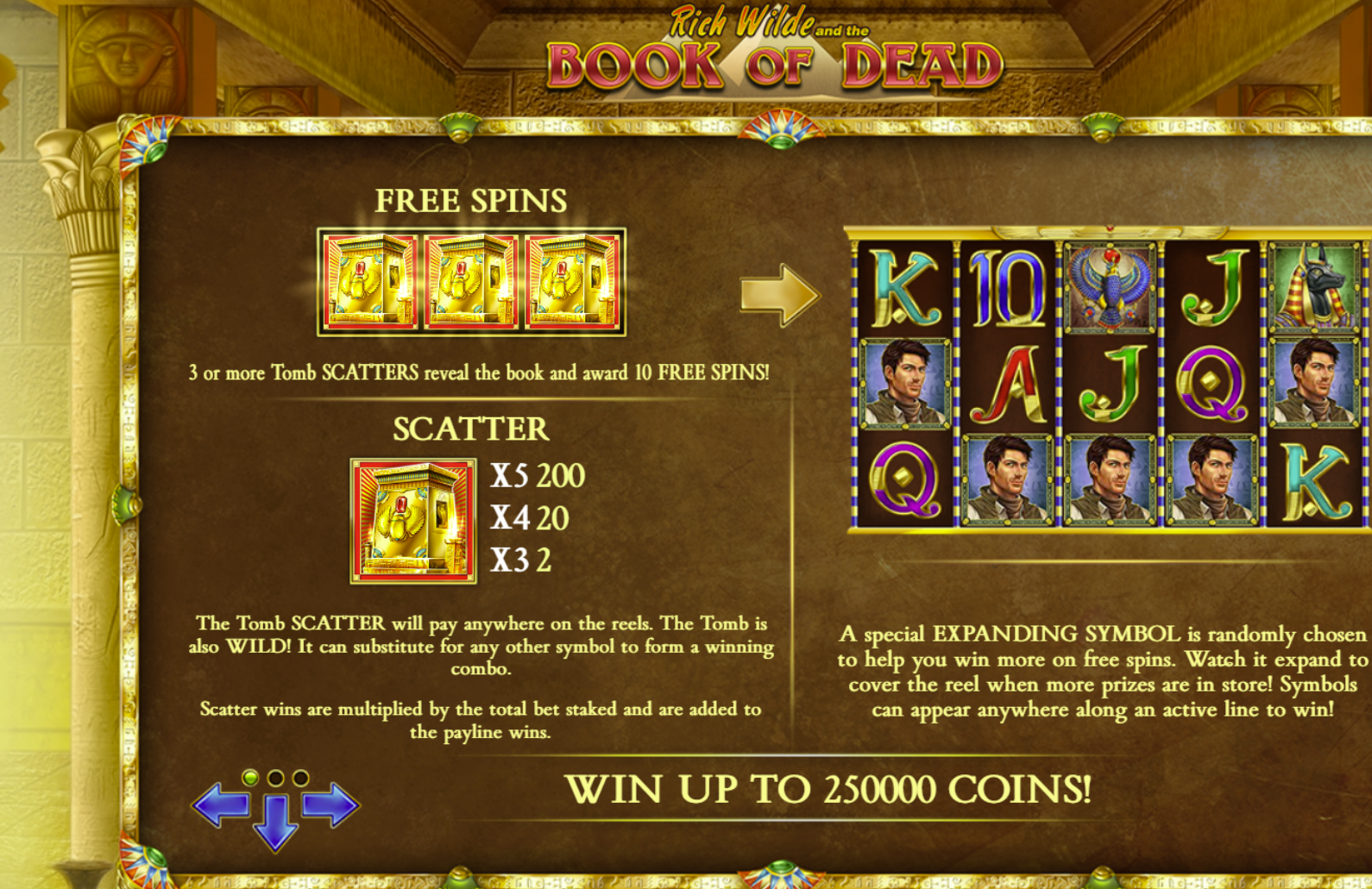 • The Book as Wild & Scatter: The golden Book of Dead symbol is the most important icon. It substitutes for all other symbols to help form wins and, when three or more appear anywhere on the reels, acts as a Scatter to trigger the lucrative Free Spins feature.